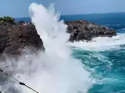 The seawater is especially blue, and the waves are pounding the rocks with a loud sound.