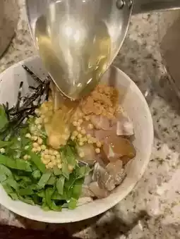 I put sashimi and shiso condiments on top and poured the moving specialty, guri tea, over it to make ochazuke 🥰