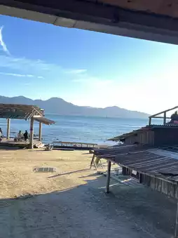 You can eat in on the slightly thrilling second floor or on a chair by the sea.