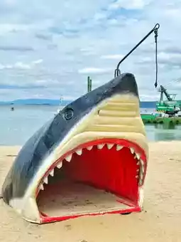There are many strange swings here, such as two-person swing, standing play swing, rocking bed swing, etc., among which my favorite attraction is Doraemon pink random door 🤣, open the door is a sea 🌊 the beach next to the swing There is plenty of play equipment, with huge driftwood, BBQ venues, shark landscaping, and screaming zip lines are among the popular photo spots on community software.