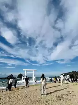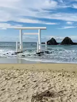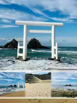 Coupo Rock is located in Munakata City, Fukuoka Prefecture, Japan. It is a group of sacred rocks that symbolize marriage and family happiness. It is divided into "Male Rock" and "Female Rock". The two are connected by a sacred rope, which symbolizes harmony between husband and wife. The scenery here is very good, with the blue ocean behind it. It is a must-visit attraction. Even more attractive than Cooto Rock is the white torii gate nearby, called the "Okino Torii". This torii gate is located in the sea and disappears and appears with the changing tides. It represents the sacred entrance and is super beautiful.