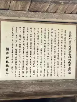 Sakurai Shrine is said to be over 600 years old. The two deities enshrined here symbolize a happy marriage and marital harmony. Parents also pray for their children's academic and career success. The shrine is generally visited by both locals and tourists. Before entering, be sure to cleanse your hands and soul at the wash basin in front of the torii gate!