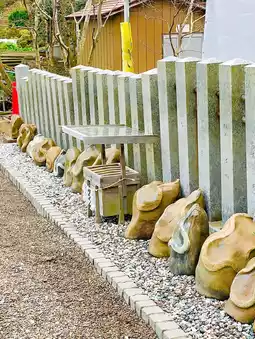There are serpentine stones with snake patterns embossed on them lined up next to the shrine.