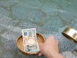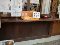 After entering the shrine, there were fresh glass wind chimes hanging on the wisteria trellis that had not bloomed. I continued to move forward. On the right were the Goshuin and Zeniwa (bamboo baskets); on the left were the amulet collection and payment area, as well as hand water and money washing water.