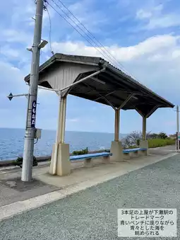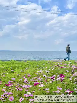 The most famous sea-view station in Japan, used as a location for many movies and dramas. From the quiet station platform, you can enjoy a unique and photogenic view of the Seto Inland Sea! ‥‥‥‥‥‥‥‥‥‥‥‥‥‥‥‥‥‥‥‥‥‥‥‥‥ ☑︎ Checkpoints ・The three-legged roof is Shimonada Station's trademark, and you can sit on a blue bench and look out at the lush ocean. ・The platform is filled with seasonal flowers grown by locals. Autumn/Winter: Cosmos, Summer: Sunflowers, etc. ・There's a cafe in front of the station! The shape is cute