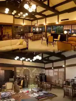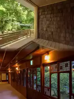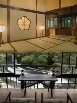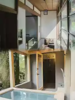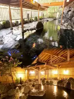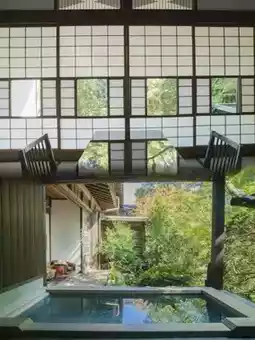 The ryokan's hot springs are sourced directly from the Amagi-Yugashima hot springs, known as 'the beauty skin bath'. It offers three different hot spring experiences: the cave bath 'Tengu no Yu', the open-air bath 'Hoshi no Yu', and the indoor bath 'Tsuki no Yu'. Bathing here, one can gaze out over the Kano River valley and blend with the surrounding natural scenery. Additionally, the ryokan provides a sauna room themed after a tea house and a tent sauna room by the Kano River, allowing guests to experience the outdoor wilderness life.