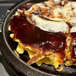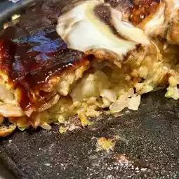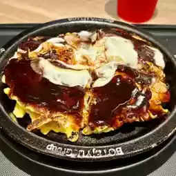 Okonomiyaki that is crispy on the outside and fluffy on the inside. The ingredients are pork, shrimp, and squid. The original dough is made with domestic wheat flour, and the rich original sauce is made with plenty of matured fruit.