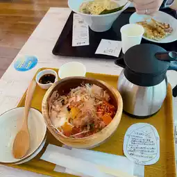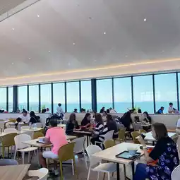 The food options here are diverse, including classic Osaka takoyaki, sashimi bowls, as well as Chinese and Korean cuisine. What's more, it offers a stunning panoramic sea view of Osaka Bay, giving you a feeling of being in Okinawa. It's the perfect way to refresh after a shopping spree! The floor-to-ceiling windows are made of smart dimming glass, allowing you to enjoy the beautiful sea view without any glare at any time. Just one floor down is a relaxing seaside area with a camping-themed Snow Peak Eat Cafe.