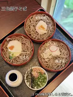 The menu I ordered this time: Sanshoku Wariko Soba🥢✨ Wariko Soba...This is the classic cold soba served in a vermilion lacquerware called a wariko.