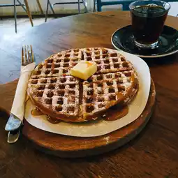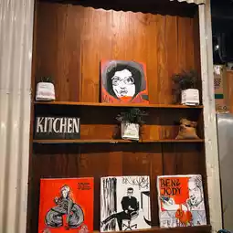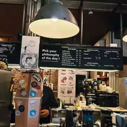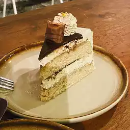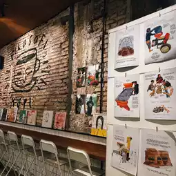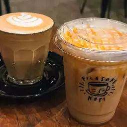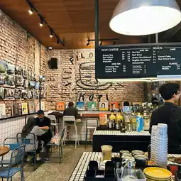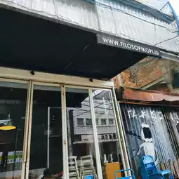 🍵 Next, let's continue to another coffee shop in Jakarta. Today, we're taking everyone to visit a coffee shop with a very distinct style. It combines paintings and bricks, giving the interior a cool look. From the outside, the shop feels very hip, especially when hip people come out to hang out. There really are people sitting like this, everyone. Some days, it's so crowded that people sit along the sidewalk 😂😂. The atmosphere at Filosofi Kopi feels really good. This is a coffee shop where you can meet friends rather than just seriously work because it's busy and quite noisy. Personally, I like it. Also, there is a space for those interested to browse products, coffee beans (for sale), artwork, and photos inside the shop 🥰👍🏻. Regarding the menu, the cakes here are very delicious. They also have waffles that are smooth and delightful, but personally, I prefer the cake. It's not too sweet, just perfectly balanced. The coffee is famously excellent 👍🏻👍🏻. As for the service, the staff here are very good. They are extremely friendly to customers, always smiling, ready to answer questions, and never annoyed.