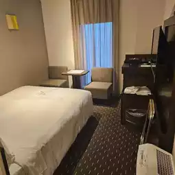 I booked a semi-double room, non-smoking. The room wasn't very spacious, but I could only open one suitcase at a time. My suitcase was 28 inches, but I could open two suitcases, which might be a bit difficult to walk around. The bed, as the name suggests, isn't very wide—a semi-double, but two people wouldn't be cramped.