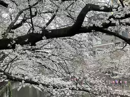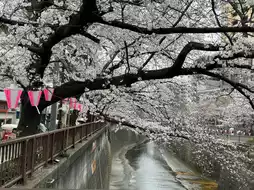 The highlight of the **Meguro River Cherry Blossom Festival** is that the cherry trees create an arch over the river, giving you the experience of walking through a cherry blossom tunnel. The contrast between the blue sky and the cherry blossoms during the day, and the fantastic night cherry blossom scenery lit up at night, fascinate visitors.