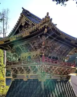 The Yomeimon Gate, a symbol of Nikko Toshogu, is a Japanese national treasure, lavishly decorated with over 500 carvings of flowers, birds, and mythical creatures. Detailed examination reveals a dragon without whiskers, mythical beasts from China, lions, and children in Tang dynasty attire playing, symbolizing peace and prosperity.