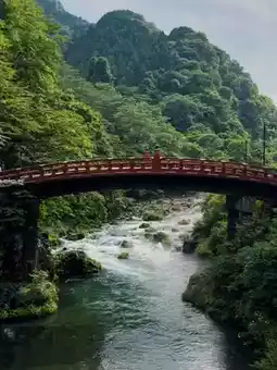 Nikko is quite a distance from Tokyo, so I had to skip other shrines and only managed a quick visit to the Shinkyo Bridge before leaving. Coincidentally, the weather cleared up, and the sun shone on the red bridge, with the river's rushing water crashing against the rocks, creating a misty, ethereal scene. Truly a divine bridge!