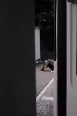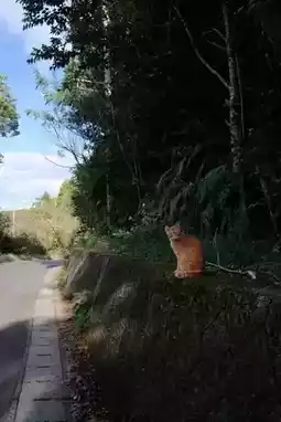 Without many stops, we transferred at the station to visit the Chichu Art Museum. Initially, we didn't specifically look for the yellow pumpkin, but spotted it as a glowing dot in the distance during the bus ride, planning to visit on the way back. On the uphill journey, the driver pointed out a raccoon and cat eating together, which turned out to be a local tanuki. We rushed back to see this amusing pair, more fascinated by the journey than the art itself.