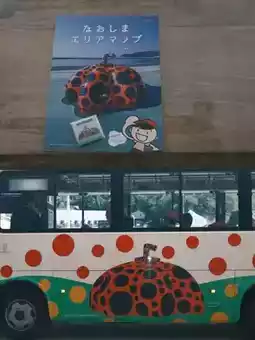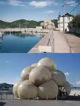 The most famous are Yayoi Kusama's red and yellow pumpkins, located at the start and end of the journey. A red polka-dotted pumpkin bus picks you up, adding to the fun. (Thanks to the driver for waiting for us to exchange money and even coming to find us!) Biking is also a great option due to the long bus intervals. Our route was casual, planning to wander and stop. We took a bus to "Art House Project," where a fascinating installation resembling a plastic bubble is actually a bike parking lot. A few steps away, you can taste Naoshima gelato from a small window shop run by one person, offering fruit sherbet and classic flavors like milk and matcha.