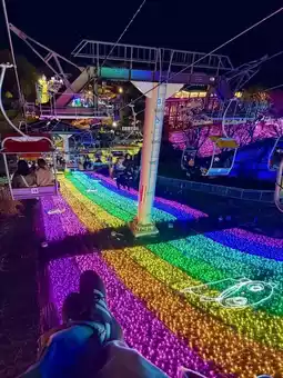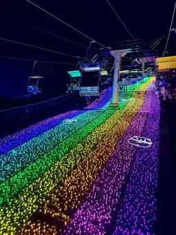 It's truly beautiful! Every corner is meticulously crafted and looks amazing. The cable car ride is super long, with a rainbow-colored light slope stretching the entire way. Next to the fried shrimp support stage, friends wave glow sticks, and there's an adorable DJ performance!