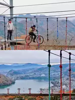 Sagamiko Resort is vast, with multiple areas offering thrilling experiences, day-use hot springs, and family-friendly activities. It provides a magical and romantic escape from urban life. For a half-day visit, try the 'Muscle Monster,' Asia's first large-scale climbing project. The arena, with its three levels and rooftop observation deck, stands impressively on a mountain top.