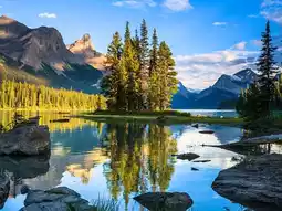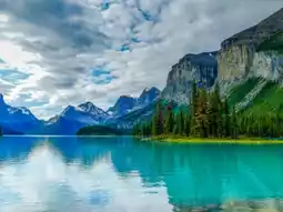 **Spirit Island**, located on Maligne Lake, is a small island that frequently appears on Canadian travel posters.