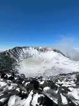 Hallasan at the end of February was in the middle of winter, to the point where the phrase "spring in March" seemed meaningless.❄️ At the beginning, the snow had melted and the ground was muddy, but after about an hour and a half to two hours of climbing, it started to turn into a snowy mountain.🏔 It was my first time climbing a proper snowy mountain, and I felt with my body that crampons and hiking sticks were essential! Nevertheless, Hallasan covered in white snow was enchanting. It felt like I was in a dream the whole way up.☺️