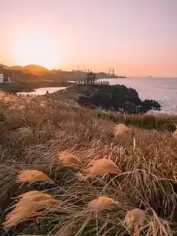 The Dakmeor Coastal Road, located in Jochon-eup, Jeju-si, presents a cinematic landscape in the fall with the Jeju sea and silver grass.