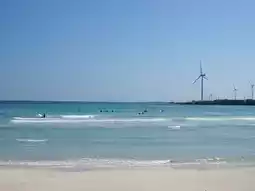 The Woljeong-ri beach on Jeju Island has a white sand beach and the sparkling emerald green Jeju sea. "Woljeong" means the place where the moon stays. The scenery is quite beautiful and many Koreans can be seen surfing here.