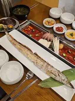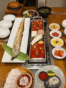 Braised whole galchi, grilled whole galchi, black pork tteokgalbi, grilled abalone with butter, marinated hanchi, dombae cold soup, seasonal raw fish, seaweed soup, stone pot rice