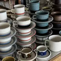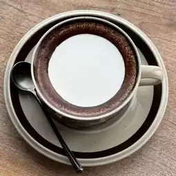 A cup of latte in a pretty mug collected by the owner