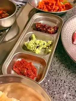 When you order 500g of salt-grilled pork, the charcoal grill is brought to your table along with a special sauce developed by Yeondong Gongyuksa and a side of fermented fish sauce. Although the staff doesn't grill the meat for you, the high heat of the charcoal allows you to cook the meat quickly. Once cut into bite-sized pieces, the pork is tender and flavorful.