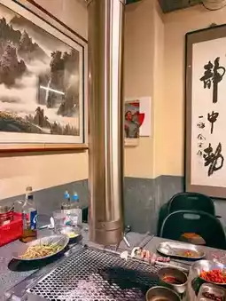 Inside, the restaurant offers tables that can accommodate groups, furnished with retro-style furniture reminiscent of a museum exhibit, giving the feeling of traveling back in time. The chairs are designed to store coats and padded jackets, preventing them from absorbing the smell of charcoal-grilled meat.