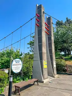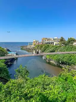 Yongyeon Cloud Bridge, a famous spot among Jeju residents, is located just a 5-minute drive from Jeju Airport. It offers a stunning view of an emerald-colored sea against the backdrop of a picturesque valley, making it a great place for photography. Situated next to Yongduam Rock, which resembles a dragon's head, the bridge lives up to its name with its long, cloud-like structure. This scenic location is where Hancheon Stream, flowing from the center of Hallasan Mountain, meets the sea. The valley below features well-developed columnar joints formed by cooling lava, creating a breathtaking view of the emerald sea. Yongyeon Cloud Bridge, near Jeju Airport, is a suspension bridge measuring 2.2 meters in width and 42 meters in length. Visitors can enjoy views of planes passing by on either side and the emerald sea below the valley. Known as a popular Instagram photo spot, the stairs leading down to the valley allow visitors to capture photos and videos with the stream and columnar joints as a backdrop.