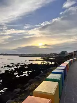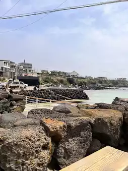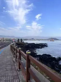 Walking from Yonghyeon Bridge to Yongduam Rock is enjoyable, and you can watch planes flying right in front of you. The weather is great, and there are interesting sights to see. If you follow the coastline, you'll find the Dodu Rainbow Coastal Road nearby. Heading further down to Aewol Coast, there's a seafood ramen restaurant with an amazing broth. In the distance, you can see the wind turbines along Sinchang Coastal Road.
