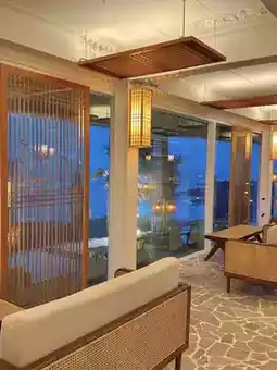 The café features a full glass window that offers a stunning view of the ocean, and the building itself is clean and modern, making every seat a perfect spot to enjoy the scenery.