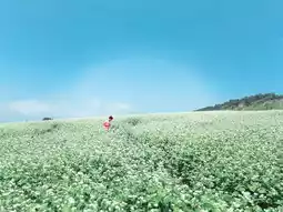 Until last year, the area was planted with canola flowers, but now it has been transformed into a white buckwheat flower field, perfect for capturing pure and clear photos.