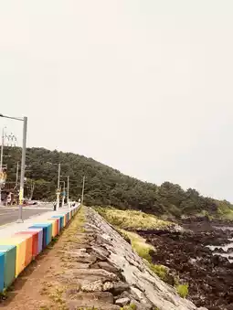 For photographers and social media enthusiasts, Dodu Rainbow Coastal Road is an absolute must-visit on Jeju Island. This iconic stretch of road is famous for its distinctive rainbow-colored coastal barriers, which provide an incredibly vibrant and unique backdrop for photos. Whether you're looking for a cheerful selfie, a dynamic shot of the road curving along the ocean, or a creative composition incorporating the colorful barriers and the sea, this spot delivers. It's particularly popular during the day when the colors pop under the sunlight, making every picture feel instantly "Jeju." The accessibility of the road means you can easily pull over (where safe) and capture those perfect, eye-catching shots that truly scream "I'm on Jeju!"