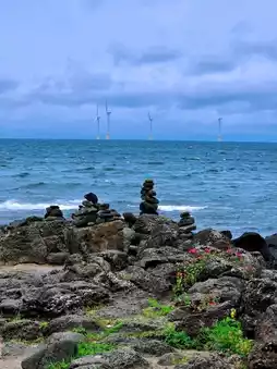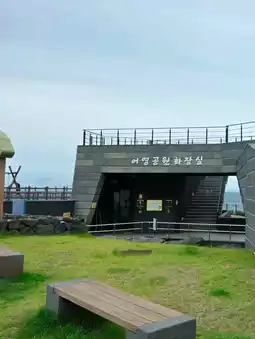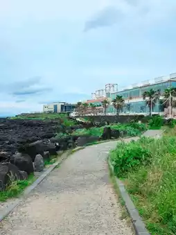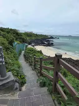 Close to Jeju International Airport and Yongduam Rock. The park stretches along the coastline and is decorated with various marine life shapes, shell sculptures🐚 and colorful railings🌈. It is a good place to see planes taking off and landing✈️🚁 and enjoy the sunset sea view🌅.