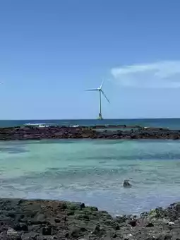 There are dozens of windmills on the coast of Sinchang, Jeju Island.