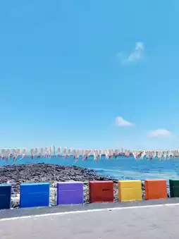 In the summer of Jeju Island, the Sunflower Garden unfolds like a golden dream. The flowers tower above shoulder height, their faces turned toward the sun, blooming passionately. The gentle sea breeze carries a salty tang, causing the petals to quiver slightly under the blue sky.