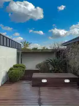 The bedroom and kitchen are separated by a garden,