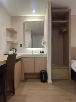 There's a Starbucks right in the lobby, so I didn't have to go far for coffee. The room was also immaculately clean and had wooden floors. 👍🏻 It was great to have a large mirror, a desk perfect for my laptop, and a separate closet!