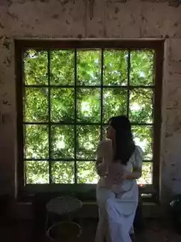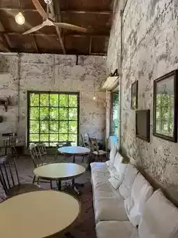 The space, with its stone walls, plants, and vintage props,