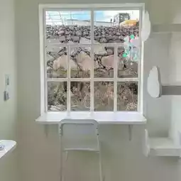 The view from the large windows and the cats framed by the windows create a truly stunning picture!