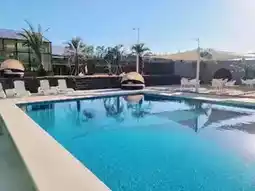 The swimming pool and shower facilities. Since there are many sunbeds outdoors,