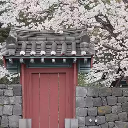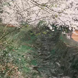 Navigate to the Jeju Folk Museum from the first stop. Don't enter through the main gate. Continue along the river on the right side of the gate. You will see a bridge on the left, with lush cherry blossoms on the bridge. There is a basketball hoop on the right side of the bridge. Walking down, you can reach both sides of the river, surrounded by cherry blossoms and feel the full romantic atmosphere.
