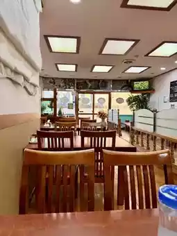 The store is surprisingly spacious, with a row of tables and a raised area.