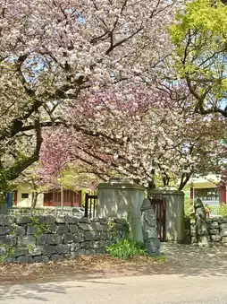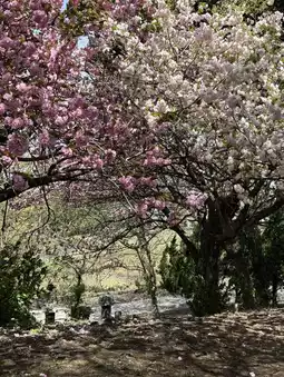 -Double cherry blossom trees in front of the pavilion at the Senior Citizens' Party