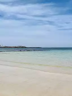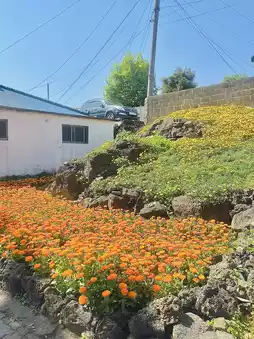 There are a lot of flowers, and I can see a lot of clear, blue seas,