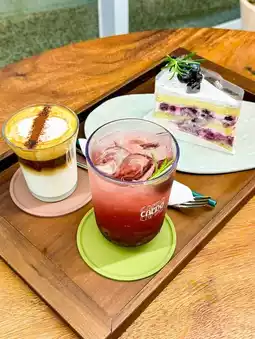 On the basement floor, there is a furniture exhibition hall, a living shop, and a one-day woodworking experience class, and on the third floor, there is a rooftop with a view of Jeju City and Mt. Halla. The menu you can order is Americano, Latte, Affogato, Hand Drip Coffee, Strawberry Latte, Matcha Latte, Cherry Blossom Ade, Cherry Chi Ade, Apple Juice, Bang-A Flower Tea, Gujeolcho Tea, and Cherry Blossom Tea, and if it is coffee, you can change it to decaffeinated. I ordered a cake with lots of blueberries along with Cream Latte and Cherry Chi Ade. The latte was filled with sweet cream and had a strong coffee flavor, which suited my taste. The blueberry cake was sweet and moist, and the cream wasn't greasy, so I'd like to recommend it to those who go there. The first floor is a bakery, and there is a large space with several tables next to the counter where you can order desserts.
