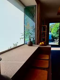 The design of logs and windows in the cafe makes the most beautiful corner of the courtyard full of wild flowers in Soomdo the background of the cafe. From the other side of the cafe, you can see the sunset at dusk when you open the door to the open-air seats.