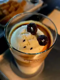 The smooth blend of strong coffee and ice cream, topped with a cute ice cream bear, makes just looking at it soothes your spirits.